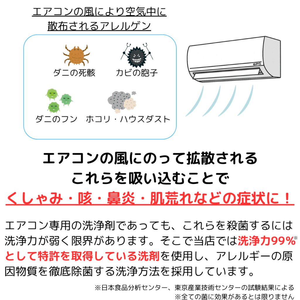 カビやホコリ(ハウスダスト)がアレルゲンとなる場合が多く、 エアコンの風にのって空気中に散布されます。