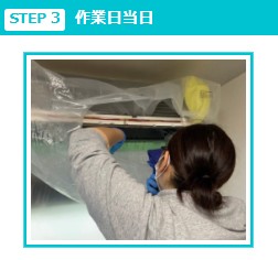 エアコン下には脚立を置いての作業となります。2畳分を目安にスペース確保のご協力をお願いいたします。